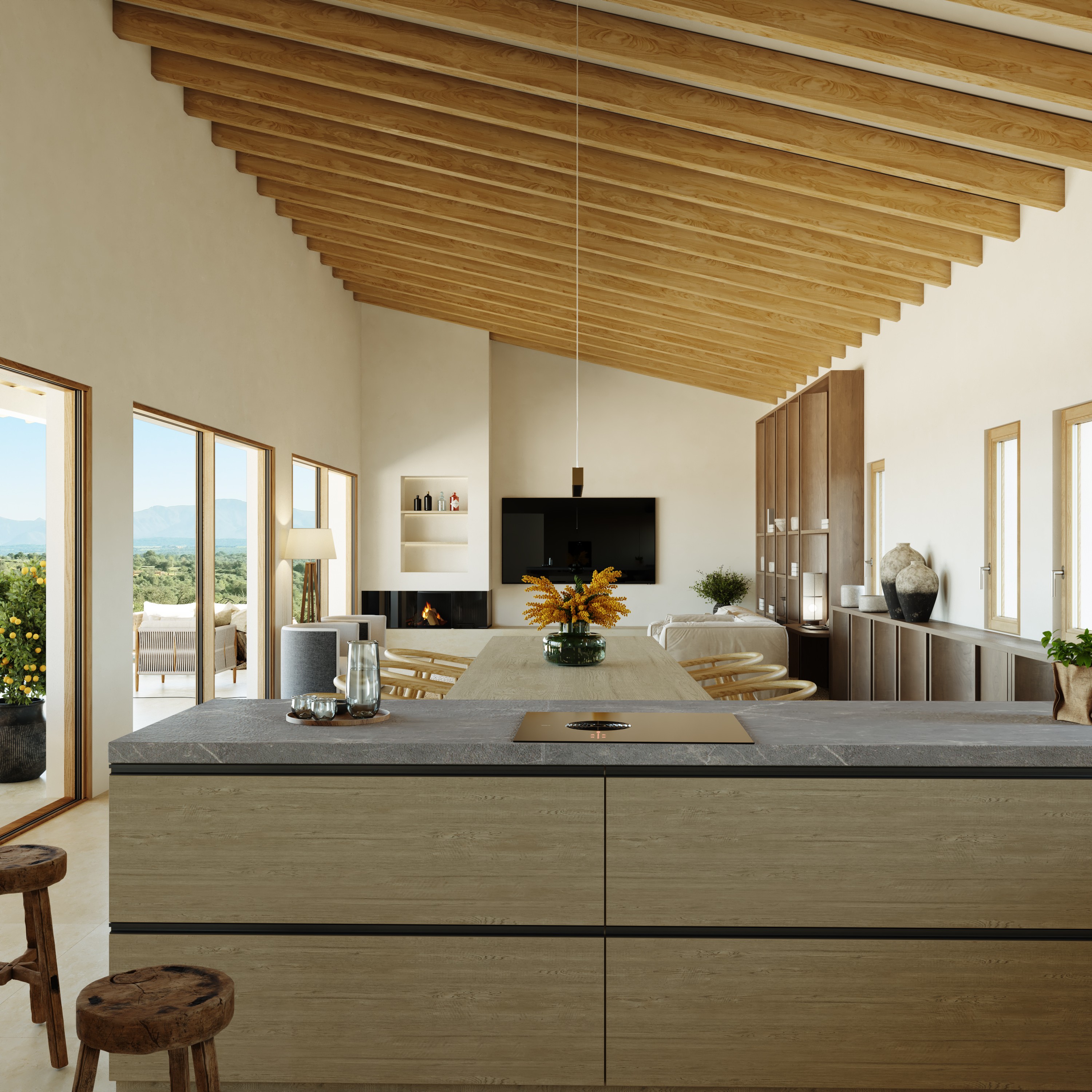 The house combines stone walls with cleaner facades. The entire living area is on the first floor, with 4 bedrooms, 3 bathrooms, and a huge space with kitchen, dining room and living room. The large covered garage of 120 m2 is located under the house. The plot has electrical autonomy thanks to a photovoltaic system as well as a robust water well. The pool is huge: 60 m2.